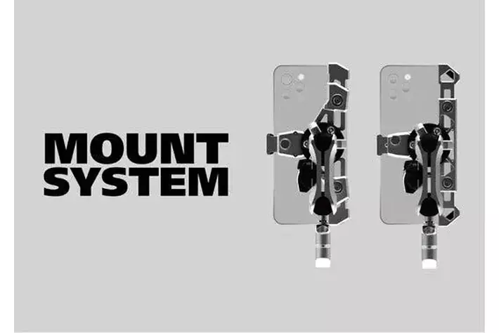 高強度オートバイ用スマートフォンホルダー「MOUNT SYSTEM」。 タフで、強く、美しい。研ぎ澄まされた機能美を持つ、「アルミ削り出し」オートバイ専用スマートフォンホルダー。
