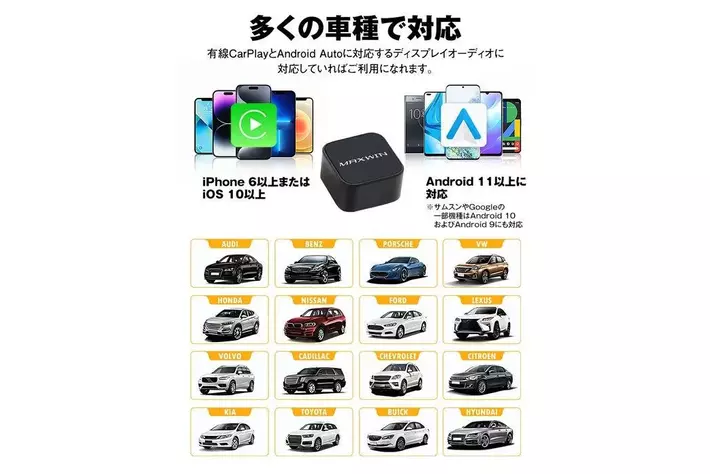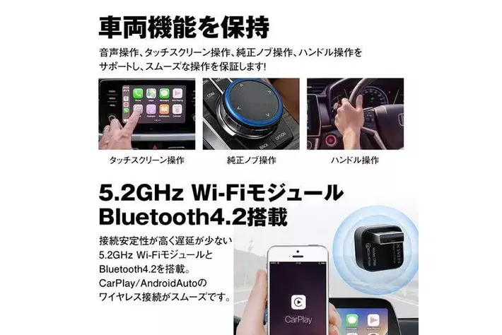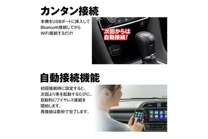 面倒な有線接続を解消でき、一度設定を完了すると次回乗車時から自動的に無線でCarPlay/Android Autoに接続されます。