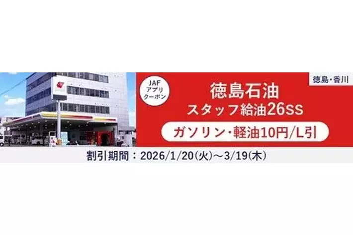 JAF(一般社団法人日本自動車連盟)徳島支部(支部長:北島義貴)は、2026年1月20日(火)から、徳島県および香川県に展開する「徳島石油株式会社」のスタッフ給油対応26サービスステーション(以下、SS)で利用可能な、JAFスマートフォンアプリクーポンの配信を開始いたしました。