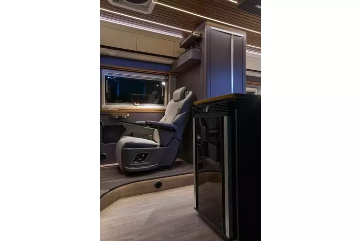 セカンドシートは敢えて1名のキャプテンシート。電動マッサージチェアが旅の疲れを癒す。落ち着きのあるシックな佇まいのインテリア。