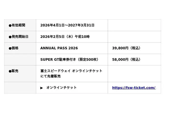 富士スピードウェイは、シーズンを通して入場できる年間パス「ANNUAL PASS 2026」を、2月5日(木)午前10時より発売します。