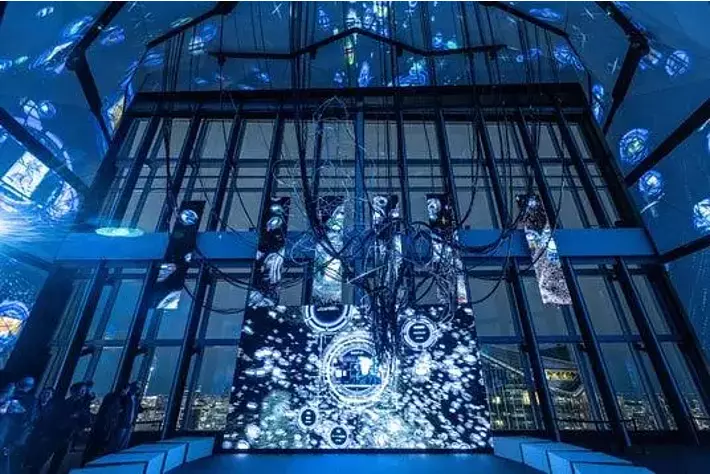 GALLERY A 「 NODE(思考の結節点)」―入り口を通った瞬間から、電脳空間へとダイブ本展の入口をくぐると、来場者は「攻殻機動隊」の情報ネットワークに接続する「NODE(思考の結節点)」へと導かれます。目の前に広がるのは、作中に描かれる「電脳空間」を想起させる巨大な没入空間です。ここには、先端技術を駆使し、アートインスタレーションやライブ演出、空間演出を得意とするアーティスティック・ディレクター 松山周平が手がけた「巨大電脳ネットワークビジュアライザー “Nerve Net”」 によって、来場者はまさに電脳空間へと“ダイブ”する感覚を体験します。