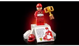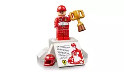 また、7度のF1世界チャンピオンに輝いた「皇帝」ミハエル・シューマッハのレゴ(R)ミニフィギュアが付属し、専用のドライバーヘルメットや優勝トロフィー、そして表彰台のパーツとともに、劇的な勝利のシーンを自宅で再現することも可能です。さらに、車両データを記載した専用ディスプレイスタンドに加え、レゴ(R)ミニフィギュア用にはシューマッハの写真と名言が添えられた特別な表彰台型スタンドも付属し、完成した後はディスプレイとしても楽しめます。