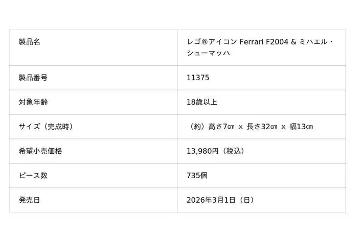 レゴジャパン株式会社(代表取締役社長:マイケル・エベスン/所在地:東京都港区、以下レゴジャパン)は、大人の『好き』や『情熱』をクリエイティブに自分で表現できる大人向けのレゴ(R)ブロックから、2004年 のF1シーズンを席巻した伝説の「Ferrari F2004」をリアルに再現した「レゴ(R)アイコン Ferrari F2004 & ミハエル・シューマッハ」を2026年2月2日(月)10時より予約受付開始、3月1日(日)より一般販売します。(※一部店舗により予約販売の日時が異なります)
