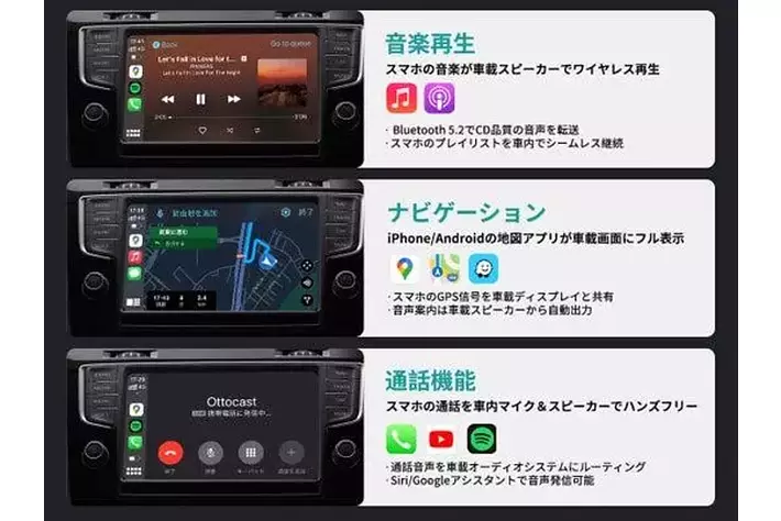 Googleマップ、Appleマップ、Spotify、Amazon Music、通話、LINE音声操作など、