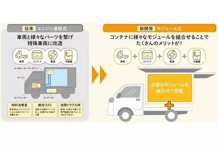 『いちばキャビン』は、車両・電源・コンテナ・冷蔵機をそれぞれ独立させたモジュール式構造を採用しています。各機能を分離することで、必要な機能を柔軟に組み合わせることが可能となり、移動スーパー車両の機能拡張や用途に応じた価値を組み合わせることを実現します。