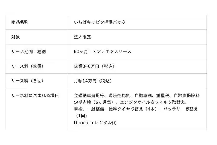 以下は、法人向けに提供する「いちばキャビン標準パック」について、車両・付帯サービス等を含めた