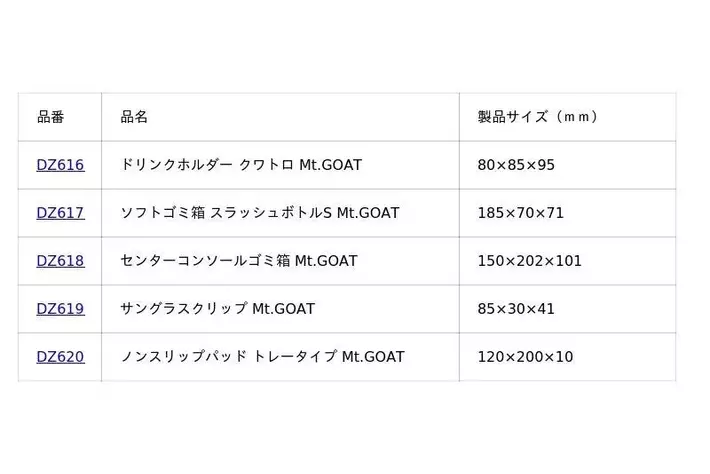 シリーズの象徴はマウンテンゴート(シロイワヤギ)。険しい地形でも自在に進むマウンテンゴートのように、“変化するカーライフにしなやかに適応する”というコンセプトを掲げ、「自然の地形美とアウトドアのワクワクを感じられる」車内アクセサリーとして企画。定評がありインテリアに取り入れやすい製品ラインアップで登場。