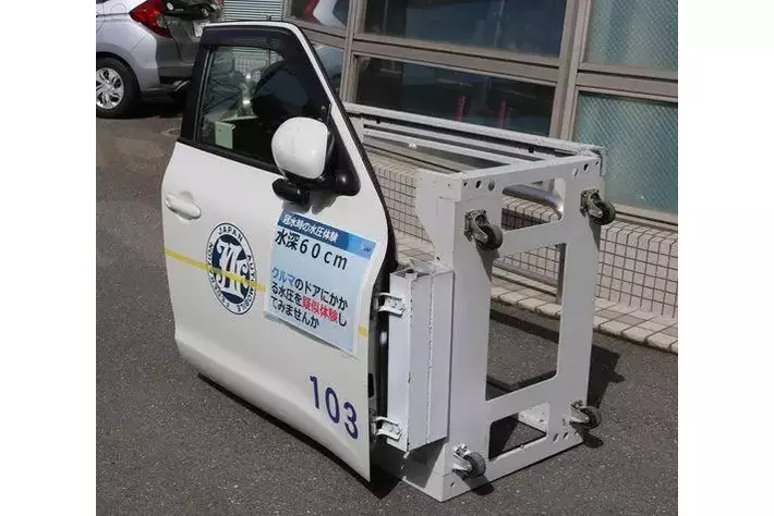 「冠水時車両ドア」は、水深60cmの水没を想定し、車両にかかる水圧やドアを開ける際に必要な力を体験できる装置です。本体験は、ドア開放や脱出の困難さを理解するとともに、水没時の行動や備えなど、防災に関する知識の向上を目的としています。