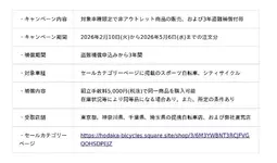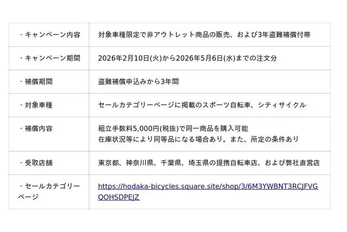 ホダカ株式会社(本社:埼玉県越谷市、代表取締役社長:堀田宗男)は、オンラインショップ「メーカー直販B級品アウトレットショップ」において2026年2月10日(火)から2026年5月6日(水)まで、新生活応援・新車セールを開催いたします。