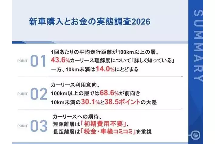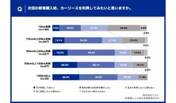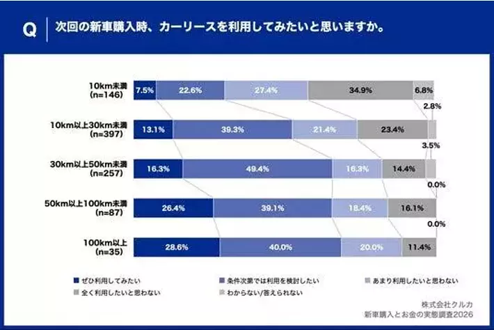 1回の走行距離100km以上の新車購入者、約7割が「カーリースを利用したい」一方、10km未満では利用意向30.1%にとどまる