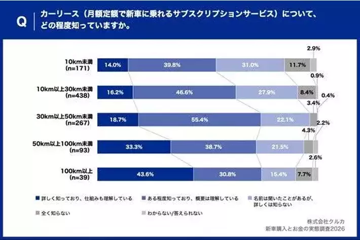まず、カーリース(月額定額で新車に乗れるサブスクリプションサービス)について、どの程度知っているかという質問では、1回あたりの平均走行距離が長くなるほど「詳しく知っており、仕組みも理解している」の割合が高くなる傾向が顕著に表れました。1回あたりの平均走行距離が100km以上の層では43.6%が「詳しく知っている」と回答し、10km未満の層の14.0%を29.6ポイント上回る結果となっています。