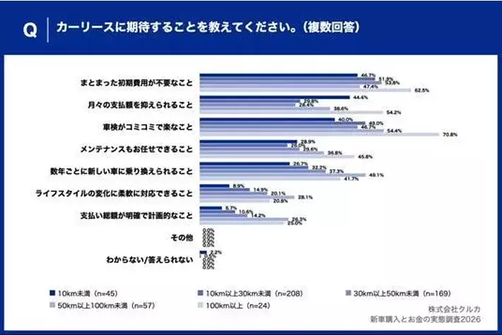 特に100km以上の層では同項目が70.8%に達し、10km未満の層の40.0%を30.8ポイント上回りました。走行距離が長く維持費負担が大きい層ほど、コスト管理のしやすさに強い期待を寄せている実態が浮き彫りとなっています。