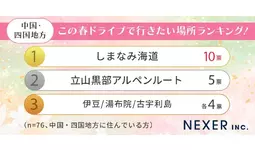 今回は、この春にドライブで行きたい場所を地域別に調査しました。全体を通して目を引くのは「しまなみ海道」の人気の高さです。関東、中部、中国・四国と複数のエリアで第1位を獲得し、瀬戸内海の島々を橋で渡る爽快なドライブへの憧れの強さが際立っています。