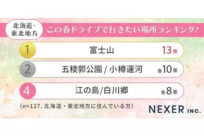 北海道・東北地方では「富士山」が第1位となり、遠方にあっても日本を代表する絶景への憧れの強さがうかがえます。同率第2位には「五稜郭公園」と「小樽運河」が並び、地元の春の名所もしっかりと支持を集めました。