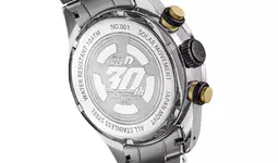 文字盤の12時位置に、インプレッサの型式GC8の「8」を配置。裏蓋にはホイールと30周年ロゴを印字。