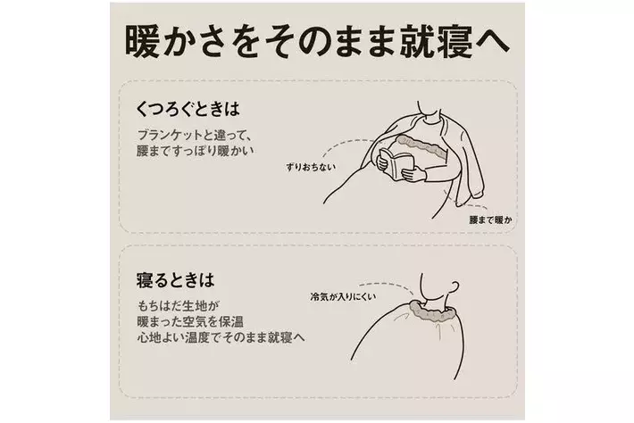 そのまま就寝しても、肩口のスピンドル調整と筒状構造により、寝返りを打っても冷気が入り込まない。