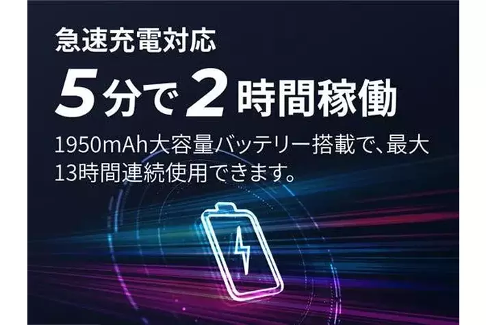 1950mAhの大容量バッテリー搭載。急速充電対応で、5分の充電で2時間稼働。旅先の電池切れを防ぎます。