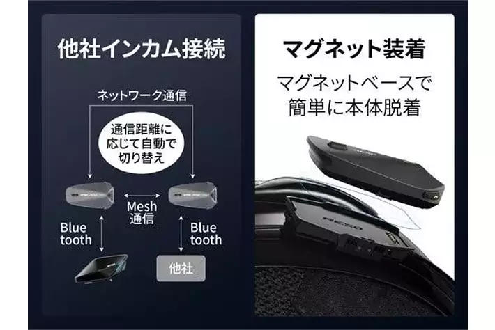 他社インカムとの接続も可能/本体はマグネットで簡単脱着