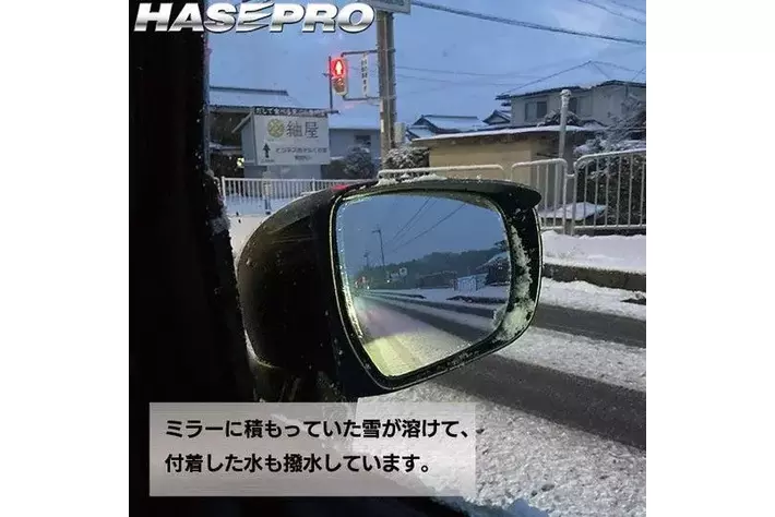 車種専用カットなのでドアミラーに合わせて施工できるので、雪が溶けてドアミラーに付着した水滴も撥水していますね!