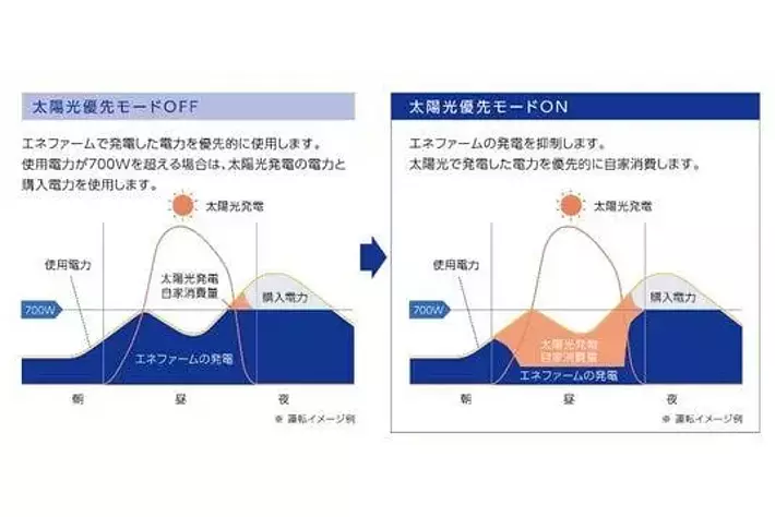 「エネファームtype S」の太陽光優先仕様では、太陽光優先モードを起動することで、太陽光の発電出力をリアルタイムで測定し、その出力に応じてエネファームの発電出力を自動で調整します。これにより、晴れや曇りの日の昼間はエネファームの発電を抑制し、太陽光で発電した電力を優先的に自家消費に回すことが可能になります。