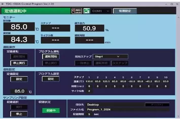 PCと接続し専用ソフトウェアを用いることで、各種設定や運転操作、およびプログラム運転が可能となり温度サイクル試験も実施できます。また、設定温度や測定温度など各種情報のCSVファイルへの収録ができ、試験データを各種PCアプリケーションで編集可能です。