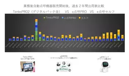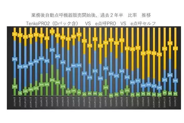 直近では自動点呼(ロボット点呼/製品名e点呼セルフ)の比率が6割前後で推移しており、自動点呼機器が主力製品となりつつあります。一方で、お客様におかれましては、「やはりヒトで対応する・対面が重要」という思想が残っており、遠隔点呼(e点呼PRO)も引き続き安定した需要があります。