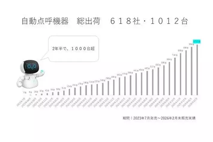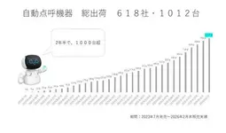 2023年7月以後、業務後自動点呼でe点呼セルフ Typeロボケビーを導入した事業者数は618法人、台数は累計1,012台となっています(2026年2月末時点)。月平均出荷台数は約32台で推移しています。