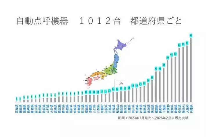 47都道府県のうち46都道府県でロボット点呼が稼働しています(前回比3都道府県増)。 出荷台数上位県は、兵庫県(87台)、大阪府(77台)、神奈川県(75台)、埼玉県(74台)、静岡県(62台)、愛知県(61台)などとなっています。