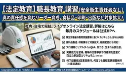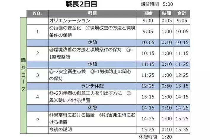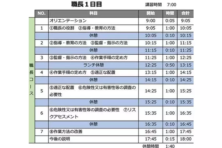 建設業、製造業(一部除く)、電気、ガス、機械修理業、自動車整備業、食料品製造業(うまみ調味料製造業及び動植物油脂製造業は、すでに対象)」、「新聞業、出版業、製本業及び印刷物加工業」など教育が必要な業種の選任される予定の方対象に、必要な知識と実務能力を習得していただくため、学科12時間のカリキュラムによる講習です。