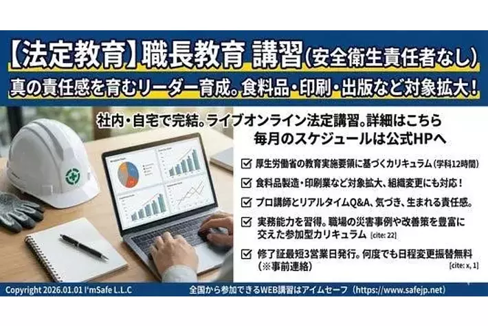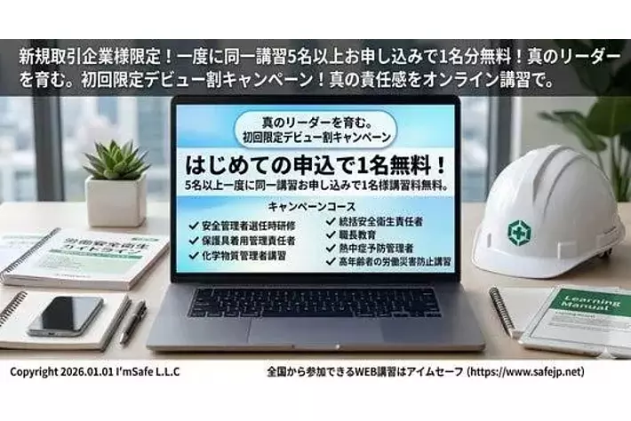 アイムセーフ合同会社では、厚生労働省通達による【職長教育(安全衛生責任者なし)】を社内や自宅から受講できる便利なオンライン講習会で実施しています。