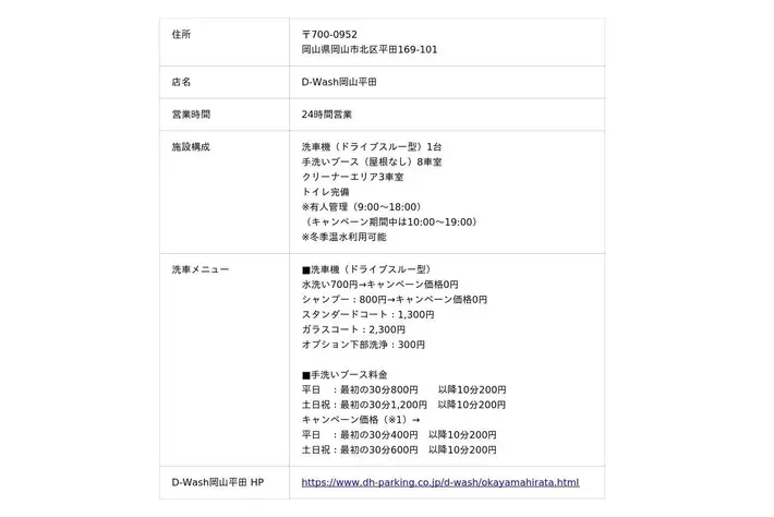 大和ハウスグループの大和ハウスパーキング株式会社(本社:東京都港区、社長:酒井太)は、2026年3月19日、岡山県内で当社初となる、純水洗車場「D-Wash(ディー・ウォッシュ)岡山平田」をオープンします。