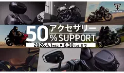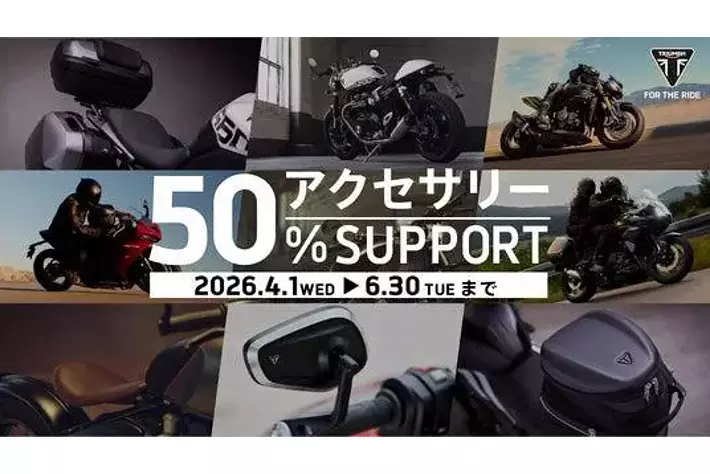トライアンフモーターサイクルズジャパン株式会社(本社:東京都港区海岸 代表取締役社長:大貫陽介)は4月1日(水)~6月30日(火)までの期間中、全国のトライアンフ正規販売店にて「アクセサリーご購入50%サポートキャンペーン」を開催することをお伝えします。