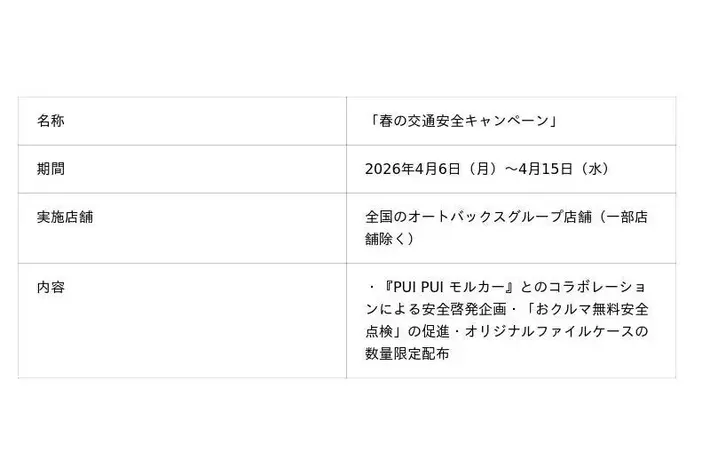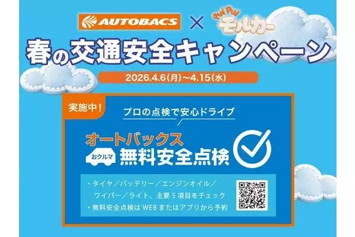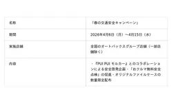 株式会社オートバックスセブン(代表取締役 社長:堀井勇吾)は、内閣府が主催する「令和8年 春の全国交通安全運動」に合わせ、2026年4月6日(月)~4月15日(水)の期間、全国のオートバックスグループ店舗(一部店舗を除く)にて「春の交通安全キャンペーン」を実施いたします。