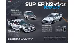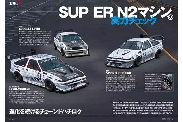 AE86のスーパーチューニングカーで争われる「スーパーN2」に参戦している、RSワタナベのレビン改トレノ、クリスタルボディ横浜のスプリンタートレノ、そしてプライベーター森さんのカローラレビンの3台が、富士スピードウェイに集結。それぞれのスペックを紹介している。