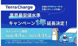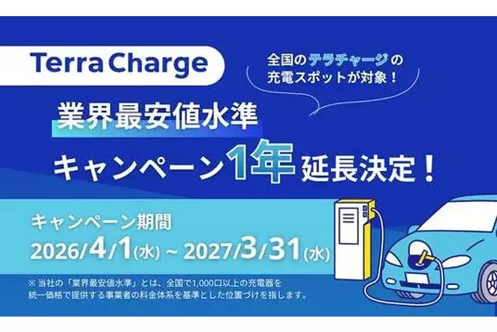 EV(電気自動車)向け充電サービス「Terra Charge(テラチャージ)」を展開するTerra Charge 株式会社(本社:東京都港区、代表取締役社長:徳重徹、以下「当社」)は、2025年10月より実施している超急速・普通充電器の料金を業界最安値水準で提供するキャンペーンについて、ご好評につき2027年3月31日(水)まで1年間延長することをお知らせいたします。