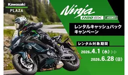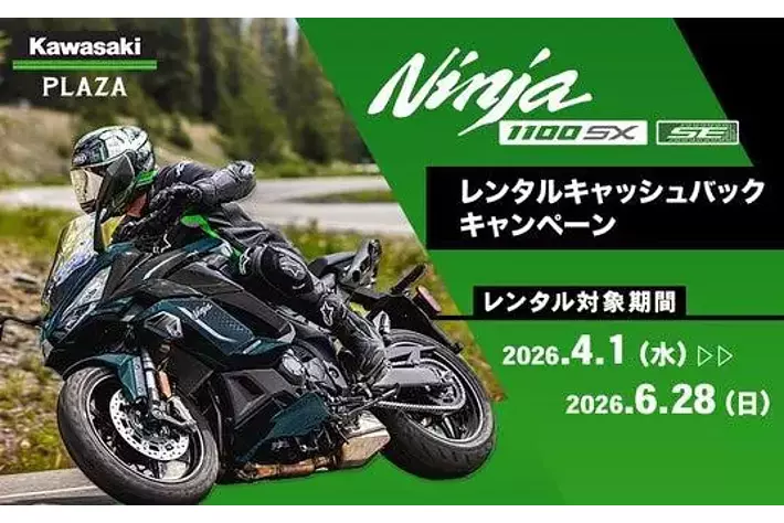 株式会社カワサキモータースジャパン(本社:兵庫県明石市、代表取締役社長:佐伯 健児)が展開するカワサキプラザネットワークでは、全国のカワサキプラザで期間中にNinja 1100SXシリーズをレンタルいただいた後、"Ninja 1100SXシリーズ"及び“Ninja 1000SXシリーズ”の新車をご成約いただいた方に、最大24時間プラン(税込 20,100円)のレンタル費用をキャッシュバックする「Ninja 1100SX レンタルキャッシュバックキャンペーン」を実施中です。