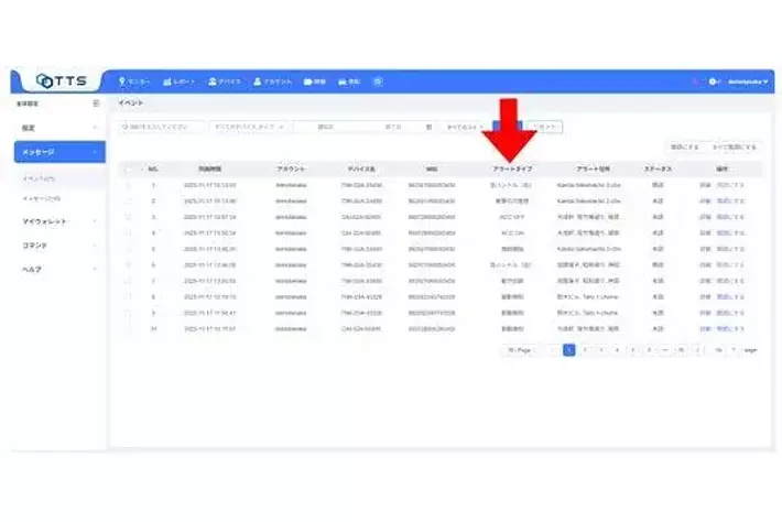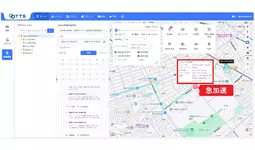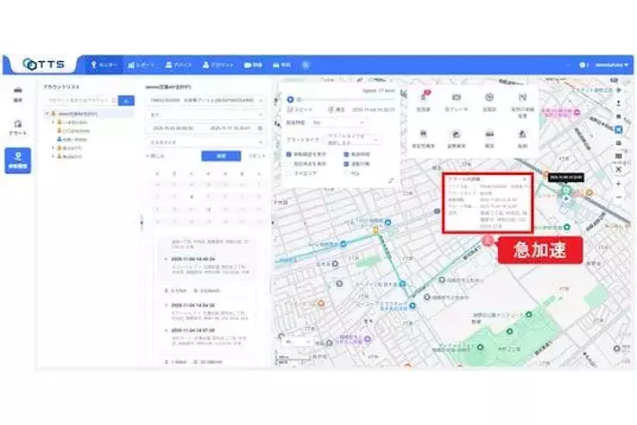 「TTSプラットフォーム画面」速度超過、振動、ジオフェンスの出入り、電源遮断などを検知し通知