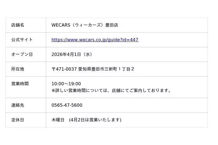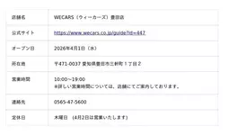 株式会社WECARS(本社:東京都千代田区、以下「WECARS」)は2026年4月1日(水)、愛知県豊田市に「WECARS豊田店」を新たに出店します。
