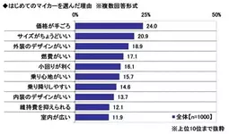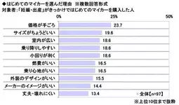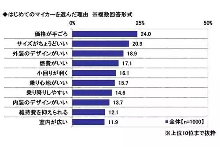 続いて、はじめてのマイカーを選んだ理由を聞いたところ、1位「価格が手ごろ」(24.0%)、2位「サイズがちょうどいい」(20.9%)、3位「外装のデザインがいい」(18.9%)となりました。