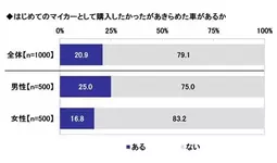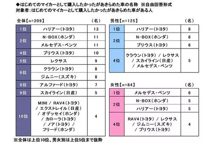 ◆「はじめてのマイカーとして購入したかったがあきらめた車がある」20.9% 購入をあきらめた車 1位「ハリアー」2位「N-BOX」「メルセデス・ベンツ」