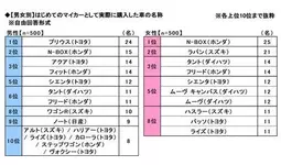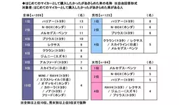 男女別にみると、男性では「プリウス(トヨタ)」(24名)が1位となり、以降、2位「N-BOX(ホンダ)」(15名)、3位「アクア(トヨタ)」「フィット(ホンダ)」(いずれも14名)、5位「シエンタ(トヨタ)」(12名)でした。他方、女性では「N-BOX(ホンダ)」(25名)が1位となり、2位「ラパン(スズキ)」(21名)、3位「タント(ダイハツ)」「フリード(ホンダ)」(いずれも14名)、5位「シエンタ(トヨタ)」「ムーヴ キャンバス(ダイハツ)」「ムーヴ(ダイハツ)」(いずれも12名)と続きました。