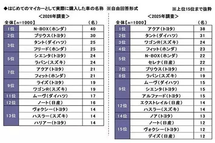 昨年の調査結果(※2)と比較すると、「N-BOX(ホンダ)」は2025年5位から順位を上げ、2026年は1位となりました。