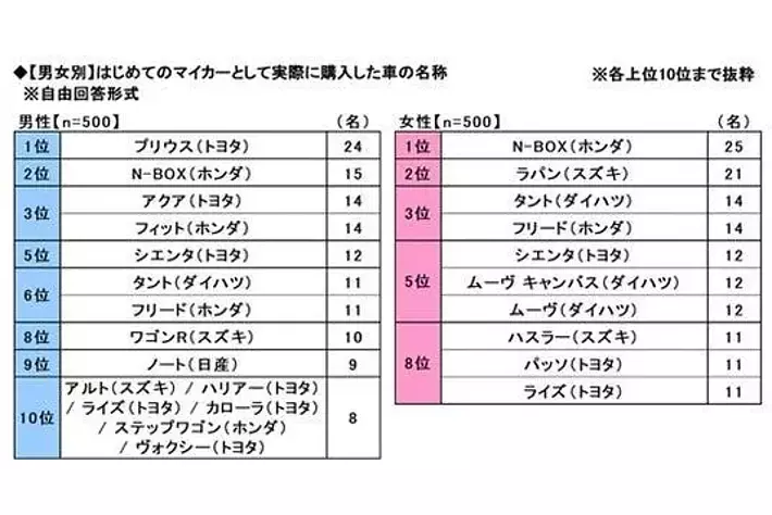 ◆はじめてのマイカーに選んだ車 1位「N-BOX」2位「プリウス」3位「タント」「フリード」 男性回答1位「プリウス」、女性回答1位「N-BOX」
