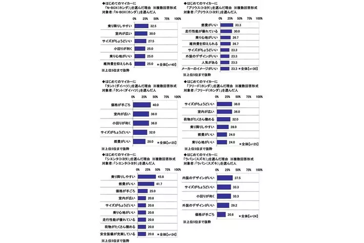 ◆はじめてのマイカーを選んだ理由 1位「価格が手ごろ」2位「サイズがちょうどいい」3位「外装のデザインがいい」 「N-BOX」では「乗り降りしやすい」、「プリウス」では「燃費がいい」が最多