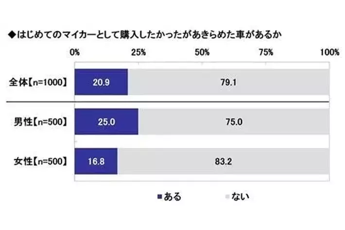 はじめてのマイカーとして購入したかったがあきらめた車があるかを聞いたところ、「ある」は20.9%、「ない」は79.1%となりました。