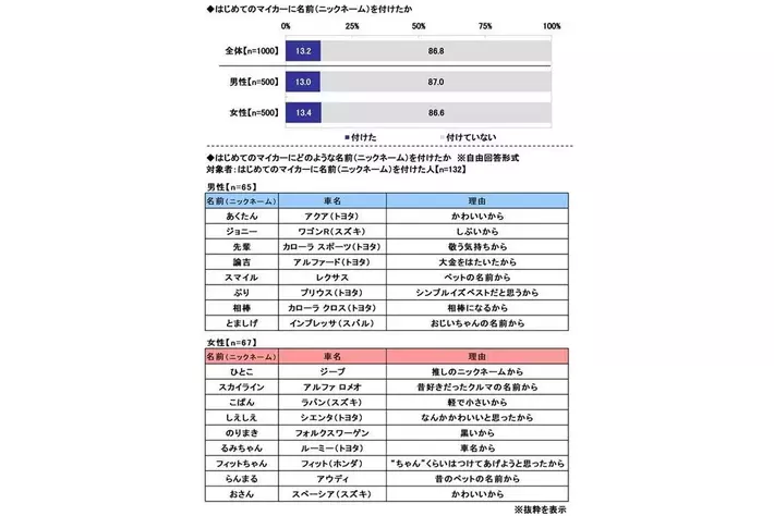 ◆「はじめてのマイカーにニックネームを付けた」13.2% 付けたニックネームは「あくたん」「先輩」「ひとこ」「のりまき」など