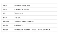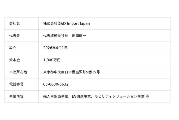 株式会社D&Dホールディングス(本社:東京都中央区、代表取締役社長:竹村 嘉規)は、輸入車事業の強化を目的として、2026年4月1日付で新会社 「株式会社D&D Import Japan」(本社:東京都中央区、代表取締役社長:氏家 健一)を設立いたしました。
