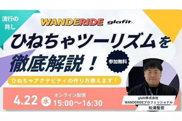 電動パーソナルモビリティの開発・製造販売をワンストップで手がけるglafit株式会社(読み:グラフィット、本社:和歌山県和歌山市、代表取締役社長CEO:鳴海 禎造、以下、glafit )は、今流行の兆しを見せる新しいスタイルの体験型観光「ひねちゃツーリズム」に関する無料ウェビナーを、4月22日(水)15:00より開催します。