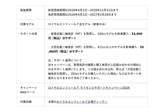 ロイヤルエンフィールド ライセンスサポートキャンペーン2026キャンペーン概要